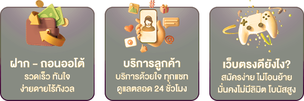 ตอบ : - ฝาก-ถอนผ่านระบบอัตโนมัติตลอด 24 ชั่วโมง - รองรับธนาคารหลักทุกธนาคาร - ไม่มีขั้นต่ำในการฝาก-ถอน - มีระบบความปลอดภัยสูง